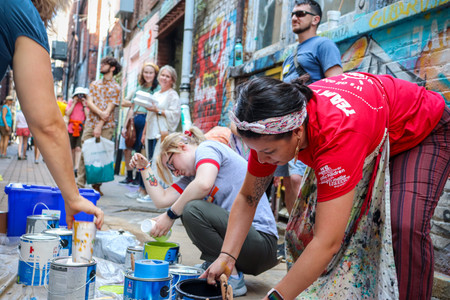 On Labor Day afternoon, visitors strolling through Strong Alley curiously looked on as 15 families worked together to paint a mural. Adults and kids of all ages stood together and let loose with color. A kid sits perched on their dad’s shoulders to reach higher. A mom squats down to guide her eager son’s brush. Two sisters chat as they stand on ladders. Over 3 hours, they make great progress.